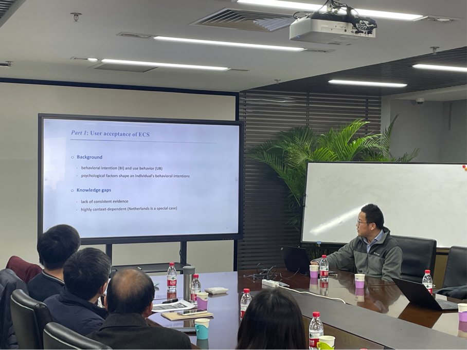 廖飞雄教授的学术报告主题为“Travel demand analyses of (electric) car-sharing”,围绕电子共享汽车的出行需求分析进行学术分享,探讨了电子共享汽车在未来的发展趋势和应用前景。报告结束后,两位老师还与在场师生们进行了热烈的讨论和交流。