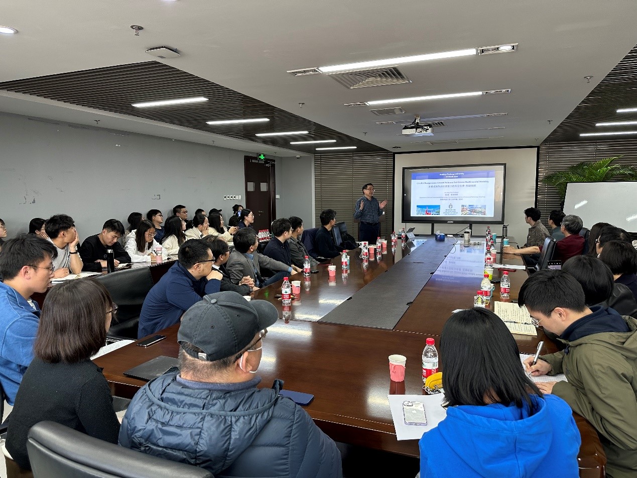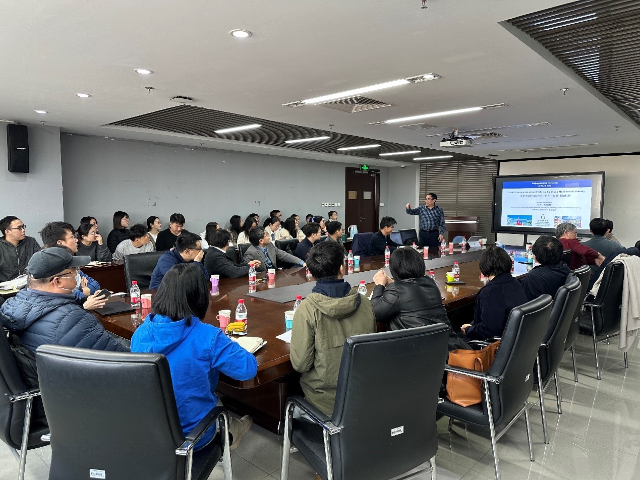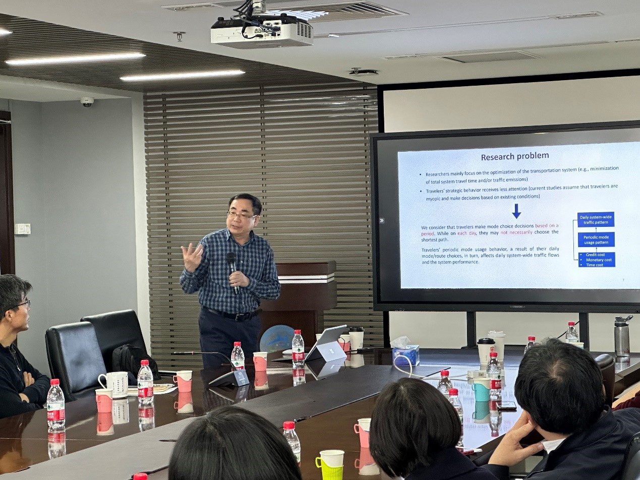 杨海教授基于促进绿色交通,缓解交通拥堵和排放的研究背景,对积分收费奖励机制(Credit Charge-cum-reward , CCR)计划进行了系统阐述,从理论上和数字上证明,所提出的CCR方案通过收费和奖励率以及差异化的收费和兑换价格来调节出行者的定期模式使用行为,从而灵活地促进多模式的出行需求管理。报告期间,杨教授还与在场师生们进行了热烈的讨论和交流。