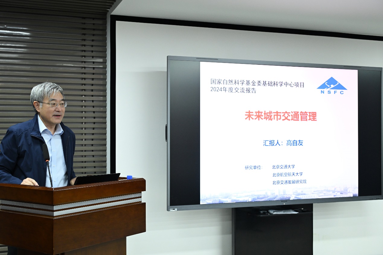项目负责人高自友教授现场汇报了“未来城市交通管理”基础科学中心项目的工作进展。他指出,中心项目组围绕2023-2024年度既定工作计划,扎实推进各项研究工作,不仅在学术高地、人才高地和智库高地建设等核心目标和任务方面取得了重要成果,为我国城市交通的未来发展与实际应用提供了坚实的科学与技术支撑,有力助推了相关领域的理论研究与实践探索。